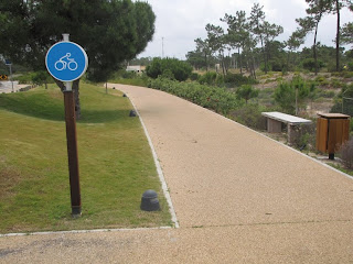 Depois de substituídas as duas câmaras de ar, arranquei em direcção a Comporta. Troia está bonita, de cara lavada, com espaços verdes arranjados, lagos e pântanos, golfs, edifícios de arquitectura descontraída, etc .. E até tem ciclovias durante bastantes quilómetros. Medidas físicas no pavimento e na geometria das vias promotoras da tão desejada acalmia de tráfego, na zona do resort, são também visíveis. Algumas rotundas completam o quadro destas medidas.